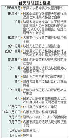 96年の普天間返還合意以降の知事選で移設問題の争点が最も鮮明で、有権者が投票時に移設問題を重視する意向を強めた。翁長氏はその審判の結果、辺野古移設を容認する仲井真氏を抑え、県内移設に反対する候補者として当選したとアピールし、日米両政府や国連に辺野古移設の断念を訴えていく方針だ。