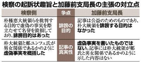 加藤前支局長はこれまでの事情聴取などで、大惨事の当日、国政の最高責任者である朴大統領がどこで何をしていたかは極めて重要な関心事だと主張。コラムは公益性があり、朴大統領を誹謗する目的はなかったと強調してきており、弁護側も公判で同様の主張を展開する。