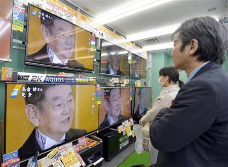 健さんの訃報を伝える家電量販店などのテレビ売り場では、昔の街頭テレビのように多くの人が画面に見入った。