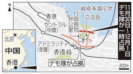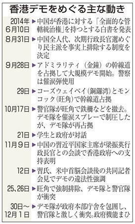 デモ隊は市内3カ所の占拠拠点のうち、先月26日の強制排除で九竜地区の繁華街モンコック(旺角)を失った。残る2カ所の死守を呼びかけているが、一時10万人を超えていた参加者は市民の支持や求心力を失い数千人に減っている。