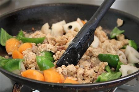 最近の料理教室で人気があった一品が「根菜と大豆のカレー」です。れんこんはきんぴらや煮物、酢の物などの定番メニューでしか使わないことが多いですが、カレー味と相性よく、大豆やピーマンなど他の食材と食感の違いが楽しめるのがよかったようです。