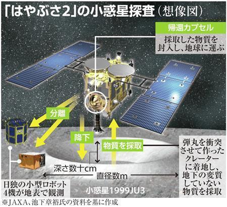 初代が失敗した探査ロボットの着陸も目指す。重力が小さい小惑星では、車輪を使うと跳ね上がって走行できない。このため東北大などが開発したロボットは、内蔵する重りを動かすなどの方法で移動を試みる。成功すれば小天体での移動は史上初となる。