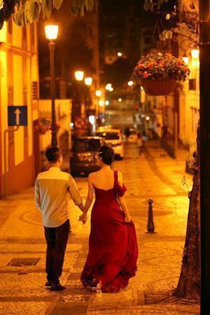 ポルトガルの植民地だったという歴史が分かるような石畳にオレンジ色の外灯、偶然通りかかったウエディングの衣装を着たカップルの後ろ姿です。頭上の花や左側の矢印のサインもアクセントになるかな?と思い、一瞬で構図を決めました。2人が遠くどこまでも続く未来を歩いていくかのようにイメージできるような、抜け感のある道を入れて撮影しました。