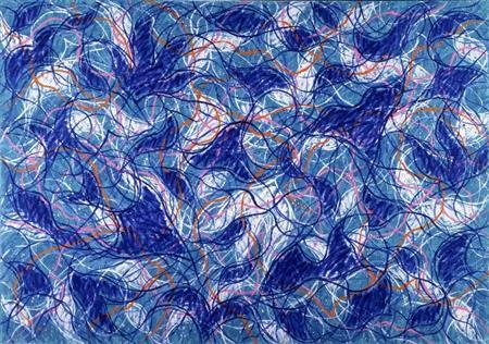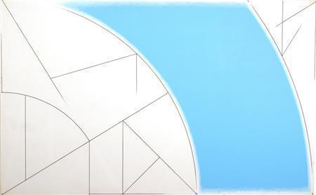 「平面上の空間 No.850」は、右側に曲がった太いブルーの帯がよぎり、左側は、定規やコンパスで描いた直線や円の一部とみられる線で構成されている。