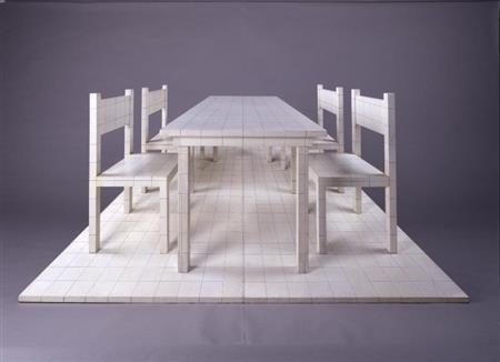 「遠近法の椅子とテーブル」を見てほしい。正面から見た写真では整然と並んだテーブルと4脚の椅子だ。ところが側面から見てみると傾斜でゆがみ、とても座れるような代物ではない。種を明かせば、1つの消失点に線が向かう遠近法(一点透視図法)にのっとって3次元の空間を2次元の製図に落とし込み、さらに、それを3次元に再構築した作品。