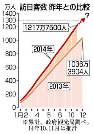 観光庁の久保成人(しげと)長官は17日の記者会見で「昨年時点で予想していなかった数字。円高の是正、免税制度、受け入れ態勢の強化など歯車がかみ合った結果だ」と振り返った。週明けには年間の訪日客が1300万人に到達する見通し。
