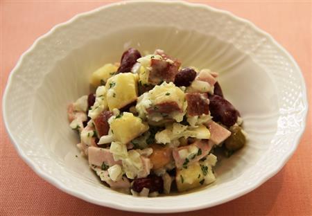 〔2〕サツマイモ、ミックスビーンズ、タマネギ、ハム、レモンを合わせて、合わせ調味料で和える。