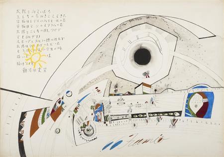 絵の余白には、詩なのか、「太陽をみていたら/エレキの音がきこえてきた/早稲田レデイのハイヒールの音/早稲田マンのスクラムの音/太陽とエレキの街、ワセダでも(orデモ)/スモッグとタバコの煙の彼方で/太陽はひとりぼっちだった/もう、ぼくには、小学生の時、/描いた太陽(太陽の絵)は/描けない」と記されている。