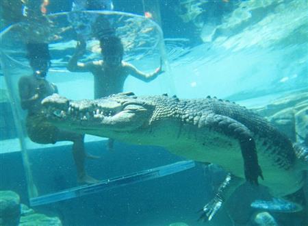 さらにスリルを味わいたいなら「ケージ・オブ・デス(死のカゴ)」(約1万6000円)がお薦め。3本の鎖でつるされた透明なケージに入り、クロコダイルがいるプールの中に入るという刺激的なアトラクションだ。