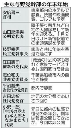 維新の党の江田憲司(けんじ)代表(58)は「政治の『せ』の字も忘れて家族サービスする」として国内旅行を企画する。共産党の志位(しい)和夫委員長(60)は千葉県船橋市内の自宅で、次世代の党の平沼赳夫(たけお)党首(75)は都内でそれぞれ静養。社民党の吉田忠智党首(58)は地元大分県であいさつ回りなどをして過ごす。