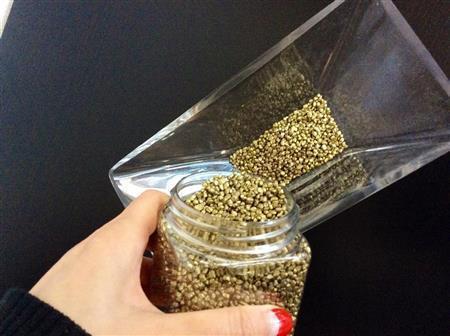 もっと粒子の細かいカラーサンドもあるので、ガラスの器と組み合わせることで、透明感あるアレンジメントを楽しめます。透明な器に花を飾る際、中のアレンジフォームや花留めが見えないように、ストーンやサンドを使ってカバーするというテクニックも覚えておかれるとよいでしょう。花と石を同色系で、あるいは反対色でコントラストを楽しむなど、ちょっとした工夫でユニークなアレンジに仕上がります。