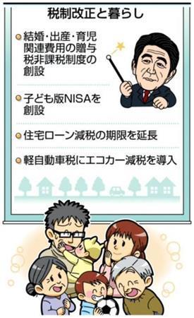 祖父母や親が一定の目的で孫や子供にお金を贈った場合、贈与税を課さない制度は大幅に拡充された。教育資金を贈った場合、1500万円まで課税しない今の制度は18年度末まで延長される。住宅を買うお金を贈った場合の非課税枠も拡大し、16年10月から1年間は最大で3000万円になる。さらに結婚や出産、育児に充てるお金を贈ると1000万円まで非課税にする制度も始める。