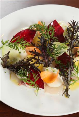 自家製テリーヌ(800円+税)は、仕込む度に食材や配合を変えるという。甘酢を使用したピクルスはやさしい酸味=2014年12月10日、京都市下京区(志儀駒貴撮影)