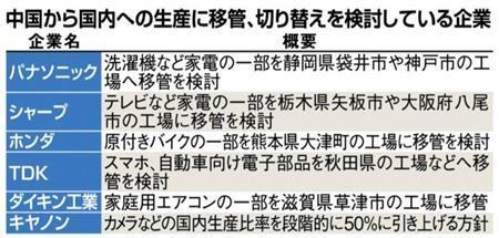 このほかには、ダイキン工業が家庭用エアコンの一部生産を中国から滋賀県草津市の工場への移管を完了した。ホンダも国内販売する原付きバイクの一部を熊本県大津町の工場への移管を検討中だ。