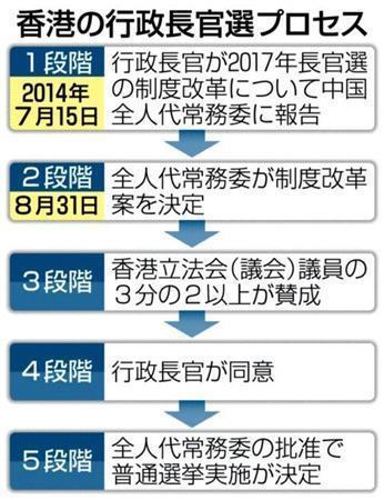 行政長官は従来、親中派が大半を占める選挙委員会での投票で決まっていた。中国は14年8月末、次期長官選に「1人1票」の普通選挙を導入するものの、反中姿勢の強い民主派には立候補を事実上認めない制度改革案を決定。これが大規模デモの発端となった。
