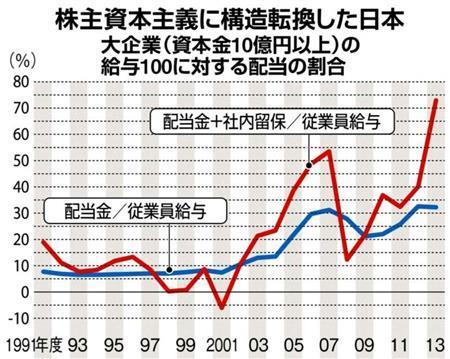 全企業が、従業員給与「100」に対し、どれだけ配当に回しているかを年度ごとにみると、1970年代後半から2001年度までは「3」前後(資本金10億円以上の大企業は「7」台)だった。この比率は02年度からは徐々に上昇し、03年度は「11.5」(大企業「32」)と飛躍的に高まった(