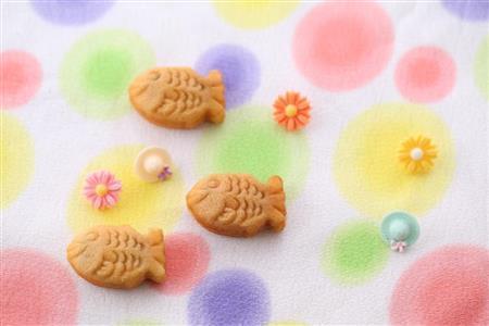 ポップな色合いの布にかわいらしい形のボタンをちりばめて撮ってみました。他のカットに比べると、たい焼きの中身にアンコではなくカスタードかチョコレートが入っているかのような洋菓子の雰囲気になりますね。背景を変えることで同じお菓子がさまざまな顔を見せてくれます。