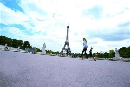 一人旅のバカンスらしいツバの大きな帽子をかぶった女性が写真を撮っている後ろ姿を撮りました。エッフェル塔と被写体がかぶりすぎず、離れすぎずの距離を探して撮りました=2014年6月30日、フランス・首都パリ(須藤夕子さん撮影)