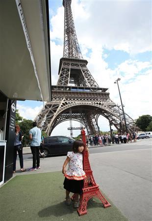 屋台のようなお店の前に、小さな赤いエッフェル塔が飾られていました。娘がこれを気に入って抱きかかえた瞬間に撮りました。