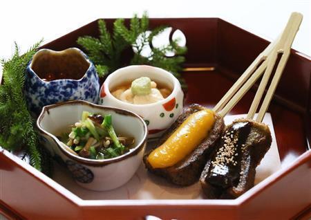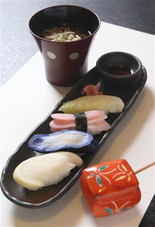ご飯ものとして長い器に盛られたのは握りずし4貫。ところが、握りのネタは魚介ではなく漬け物だ。「観光客の方は『何?これ』と驚かれます」(手嶋料理長)という通り、意表を突く。ネタの“正体”は、柚子の香りがする大根▽和歌山産のナス▽ノリで巻いた日野菜▽シャキシャキとした歯応えの白菜-だ。