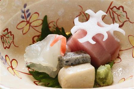 おつくりは鯛とヨコワが皿に盛られる。ヨコワとはマグロの幼魚で脂が乗った鯛もヨコワもちょうど食べ頃。生麩のおつくりも一緒に提供され、ワサビを多めに溶いたしょうゆにつけて口に含むとツンと鼻をつく刺激が心地よい。雪の結晶の形に切り取られた大根と金時ニンジンも添えられ、見た目も楽しめる。