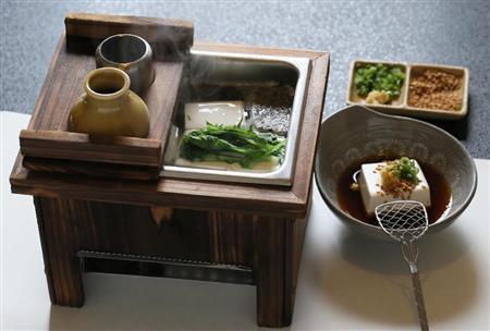 次に、高さ約15センチの木箱が登場。これぞ一人用の湯豆腐セットだ。燃料に火をつけるとぐつぐつと音を立てて煮え始め、沸き立つ湯気が食欲をそそる。木製の蓋を取るとステンレスの鍋の中に絹ごし豆腐が沈む。一緒に熱せられている壺に入った出汁(だし)を小鉢に移し、すくい取った豆腐を出汁に浸して味わうと、とろけそうに軟らかい。