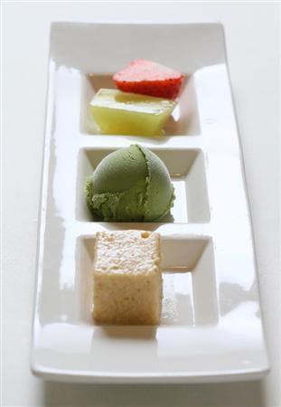 デザートはリンゴのムースと抹茶アイス、イチゴとメロンで、会席料理を締めくくる。ムースは青森県産のリンゴをすりおろしゼラチン、卵白で固めた立方体で提供されるが、その甘みは絶品だ。女性客が多いそうだが、手嶋料理長は「料理にも小さなアイデアを積み重ね、もう一度来てもらえる店づくりに努めたい」と笑った。(文:巽尚之/撮影:志儀駒貴/SANKEI EXPRESS)