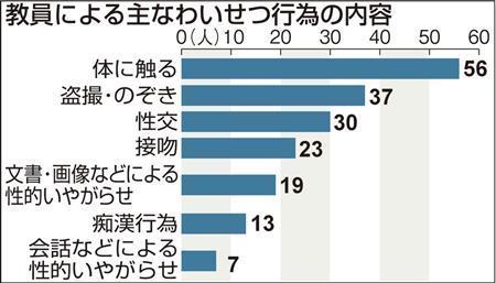 調査は47都道府県と全20政令市の教育委員会を対象に実施。205人が処分を受けたわいせつ行為の内容は、「体に触る」が56人で最も多く、「盗撮・のぞき」37人▽「性交」30人▽「接吻」23人▽「文書・画像などによる性的いやがらせ」19人-など。わいせつ行為に及んだ場所は「自動車内」31人▽「自宅」24人▽「電車やバス」21人-などが目立つ。