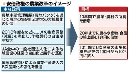 政府はこれまで、18年度をめどにコメの生産調整(減反)を廃止することを決めたほか、「農地中間管理機構」を通じた農地集約も進めている。小規模・零細農家の保護に重点を置いた農政から脱却し、農業経営の大規模化を促進するのが目的だ。