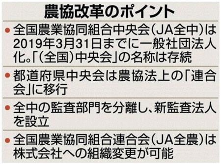 各地域農協は理事を選んだり、組合員の加入を認めたりする際、それぞれの農協のある地域の農業従事者を対象とするようJA全中に求められていた。今後は地域農協が理事に経営者や流通業者など農家以外の人材を積極的に登用することや、農家が農協への加入を自由に決めることが想定される。その結果、「本当に強い農協だけが生き残り、国内農業の底上げにつながる」(農水省幹部)というわけだ。