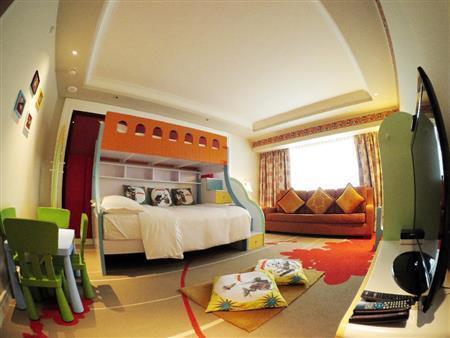 部屋の4つの面と天井を入れて撮影することができました。こちらはドリームワークスのキャラクターをテーマにしたファミリールームの人気キャラクター「カンフー・パンダ」の客室を撮影したモノです。