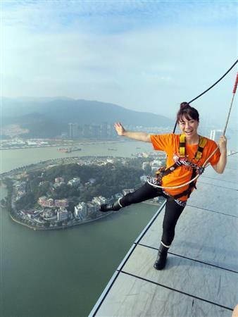 マカオタワーのスカイウォークにチャレンジしました。インストラクターの方が撮ってくれた写真です。背景も人物の表情もしっかり写っていて、さすがですね。スカイウォークは788香港ドル(約1万1900円)で、写真もたくさん撮ってくれ、最後にデータをUSBでプレゼントしてくれます。