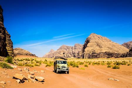 ヨルダンでは、砂漠で一晩を過ごすツアーを体験した。向かったのは、中部に広がる「ワディラム砂漠」。砂漠の入り口までバスで行き、4WD車に乗り換えて荒野を進む。見渡す限り、砂の世界が広がる。