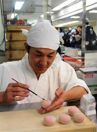横浜高島屋(横浜市西区)8階で行われている全国のうまいものを集めたグルメ催事の1コーナーに25日、白衣に身を包んだ青年が勢ぞろいした。いずれも3~8代目、30~40代の若主人たちだ。「7人の侍」ならぬ8人の和菓子の「若き匠(たくみ)たち」は1年前、全国の和菓子店を回って買い付ける高島屋のバイヤー、畑主税(ちから)さん(35)の音頭で「ワカタク」というチームを結成。昨年9月、東京・新宿高島屋でイベントを初開催し、今回は第2弾となる。