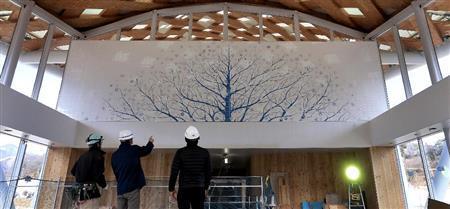 駅舎の2階には、温泉施設「女川温泉ゆぽっぽ」を併設。こちらは「まちびらき」翌日の22日にオープンする。日本画家、千住博氏(57)と鉄道デザインで知られる水戸岡鋭治氏(67)をアートディレクターに迎え、浴室、脱衣所、待合室の3カ所の壁面には計6037枚のタイルを使った壁画が描かれる。待合室に描かれた「家族樹」は幅約10メートル、高さ2.7メートルの巨大タイルアートで1188枚のタイルを使用。樹木には女川町民らから公募した花のイラストがちりばめられる。