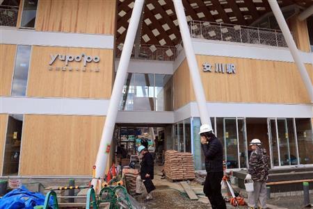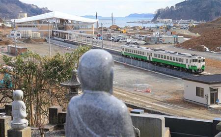 震災後、既に約9メートルのかさ上げ工事を終えた新しい町の核となるのが女川駅舎だ。早くから被災地に入り、避難所を段ボールの筒で仕切りプライベートな空間を創出したり、住宅地が不足した女川で3階建ての仮設住宅を提案した建築家の坂茂(ばん・しげる)氏(57)が設計を担当。白い屋根は、港町で羽ばたくウミネコをイメージしたという。総工費は8億5000万円。