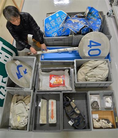 一方、福島県では県立博物館を中心に保存活動が行われている。当初は東京電力福島第1原発事故の影響で沿岸部の活動が制限されていたが、今年度から「ふくしま震災遺産保全プロジェクト」が始動。津波でひしゃげた車や交通標識、印刷したものの配達できずに販売店に残った震災や原発事故を知らせる新聞の束などが集まっている。(写真報道局 三尾郁恵/SANKEI EXPRESS)