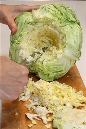〔1〕早春キャベツの芯をくりぬき、直径8センチ大の穴を開ける。穴から出したキャベツは、1センチ大のざく切りにする。