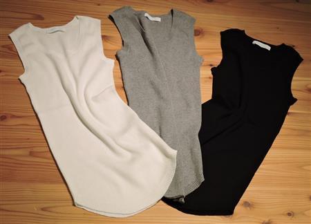 自作のニットパンツ(2万1000円)にニットタンクトップ(1万4000円)をインナーに着たデザイナー佐々木杏さん=2015年3月17日、神奈川県横浜市西区(藤沢志穂子撮影)