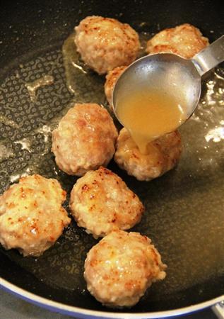 コラーゲンは煮ると煮汁にも出るので、無駄にせず汁も飲みましょう。このつくねは蒸し煮をするときに、水を加えるため、蒸し汁にもコラーゲンがしみ出ます。肉のうま味も出ているので、その汁をつくねにかけながら仕上げましょう。