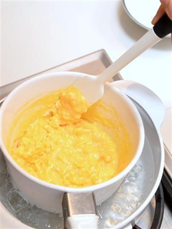 〔3〕卵2個、卵黄2個を合わせ、白身を切りながらしっかりとく(B)。粗熱が飛んだAとBを合わせこす。型に注ぎ、表面の気泡をのぞく。