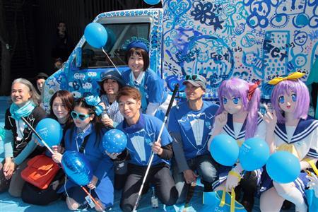 「原宿・表参道・青山を青く染める!」を合言葉に5カ所で開催された「Warm_Blue_Day_2015」の多彩なイベント=2015年4月2日、東京都内(越智貴雄さん撮影、提供写真) 4月2日、国連が定めた世界自閉症啓発デーのこの日。Get in touchは、東急プラザ 表参道原宿のエントランスと6階のおもはらの森、BA-TSUアートギャラリー、伊藤忠青山アートスクエア、東京タワーの5カ所同時進行で「Warm Blue Day 2015」のイベントを開催した。「原宿・表参道・青山を青く染める!」を合言葉に、街には思い思いのブルーを身に着けた、多様な人々が集まった。