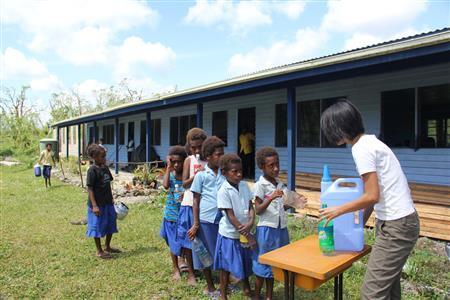 支援物資の飲み水を手にするバヌアツの子供たち=2015年3月31日、バヌアツ(相川梨絵さん撮影) 皆さんも、ご存じのとおり、3月13日バヌアツは超巨大サイクロンPAMによって、全土に非常事態宣言が出るほどの大きな被害を受けました。休暇中の私はたまたま日本にいて難を逃れましたが、私の知人、友人も類にもれず、ほとんどのバヌアツ人が、家や家財道具などすべてを一瞬にして失いました。そして、サイクロン被害から2週間後、私たち夫婦は、とりあえず娘を日本においてバヌアツへ戻りました。