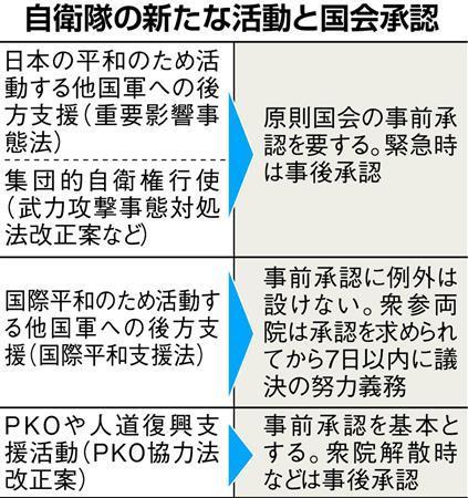 21日の安全保障法制に関する与党協議会では、国際平和のため活動する他国軍の後方支援について例外なく国会の「事前承認」を必要とする案が了承された。緊急事態でも迅速な自衛隊派遣が難しくなるため自民党側には懸念も強かったが、歯止めを求める公明党への譲歩を余儀なくされた格好だ。