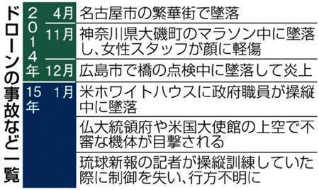 国内でも、名古屋市の繁華街で昨年4月に無人機が墜落。神奈川県大磯町では昨年11月、マラソン大会の空撮中に墜落し、女性スタッフが軽傷を負った。(SANKEI EXPRESS)