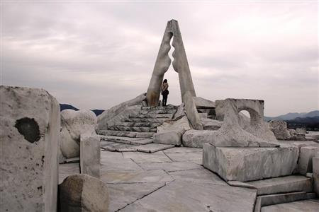イタリアから運んだ大理石を助手と2人で掘っては運び、重機を使って組み立てた。設計図はいっさいない。「回りの山並みや海と対話して、この石はどこに行きたがっているかをよく聞いてそこに持っていった」と話す。「こうすると空間が躍動するのです」
