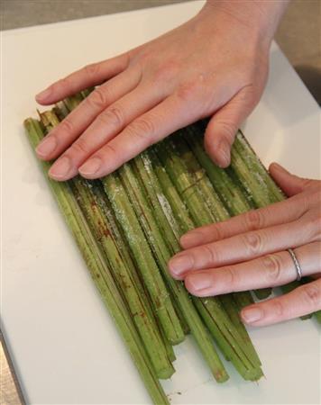 フキは「おべんとうばこのうた」の通り、すじがあり、繊維が硬いので、写真のように塩でもんで板ずりし、ゆでて皮をむいてから使います。板ずりはフキ4~5本につき塩大さじ1~2が目安です。板ずりすることによって、フキの緑色が鮮やかになり、皮もむきやすくなります。