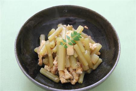 〔1〕フキは鍋の直径に合わせて切り、洗って、塩(分量外)をまぶして板ずりする。沸騰した湯で硬めにゆで、水にとって冷ます。皮をむいて斜め3~4センチ長さに切る。