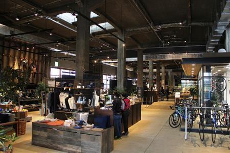 英国のファッションブランド「PAUL_SMITH」と尾道の自転車複合施設「ONOMICHI_U2」のコラボレーションによって生まれた製品がおしゃれなディスプレイで並べられた=2015年4月10日、広島県尾道市の「ONOMICHI_U2」(田中幸美撮影)