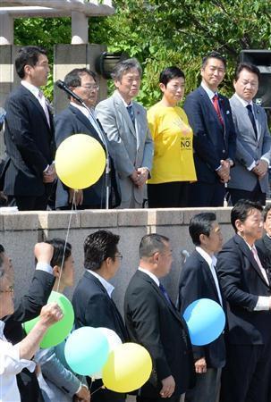自民党大阪府連会長の竹本直一衆院議員(74)は「年2200億円が大阪市から大阪府に吸い上げられ、市民には大損だ」「住民サービスが不便になる」と気勢を上げた。安倍晋三政権批判の先頭に立つ民主党の辻元清美衆院議員(55)も参戦し、「党派を超えて『大阪党』として立っている。ぜひ否決してほしい」と呼び掛けた。